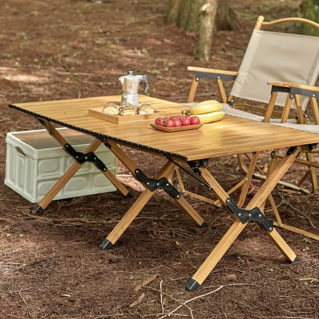 Take the comfort of home to the great outdoors with this premium folding roll-top camping table. Designed for adventurers and nature lovers, this table offers a sturdy and reliable surface for meals, games, or gear organization during your trips. Its clever wood-grain finish provides a natural aesthetic while maintaining the durability of modern materials.