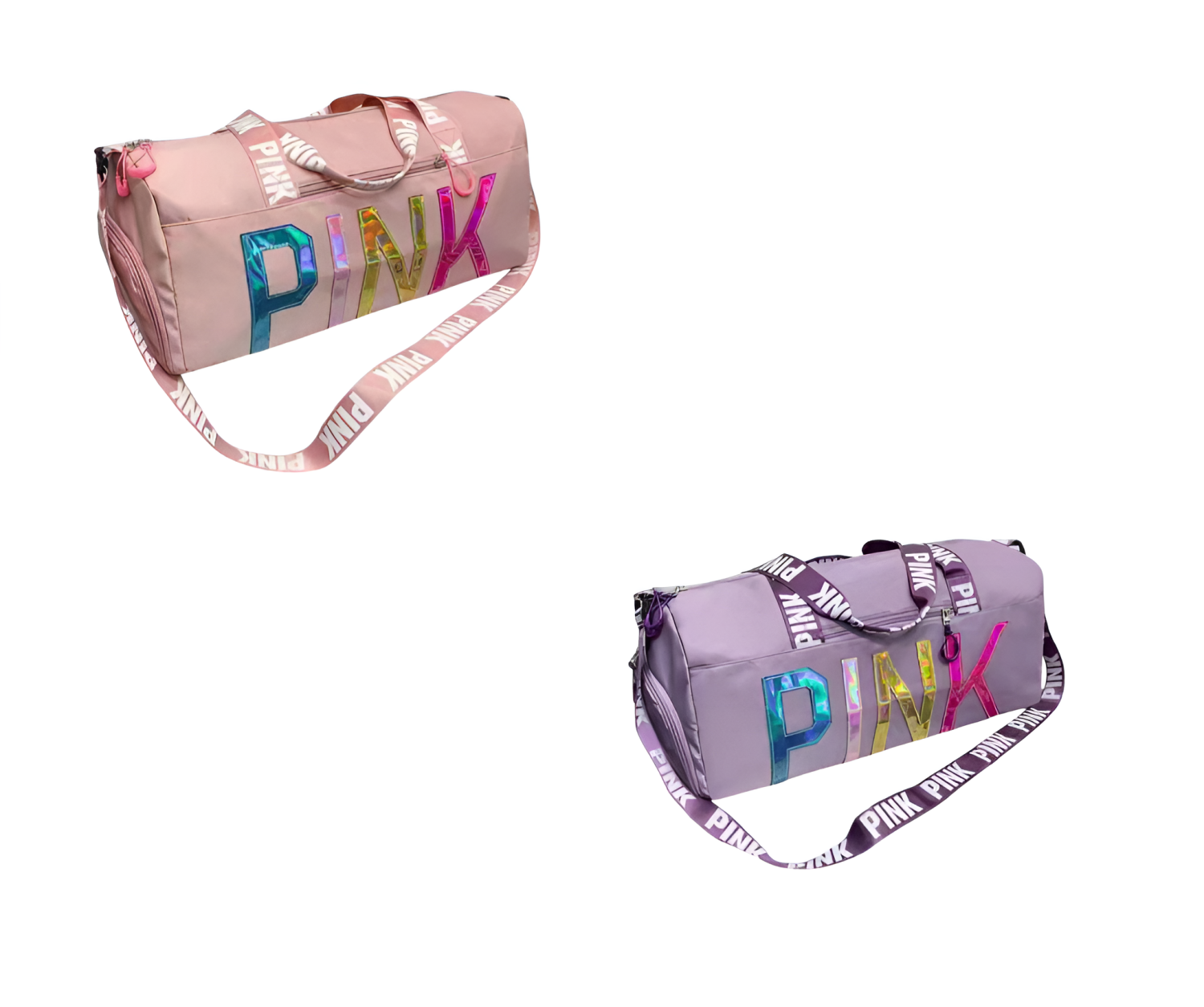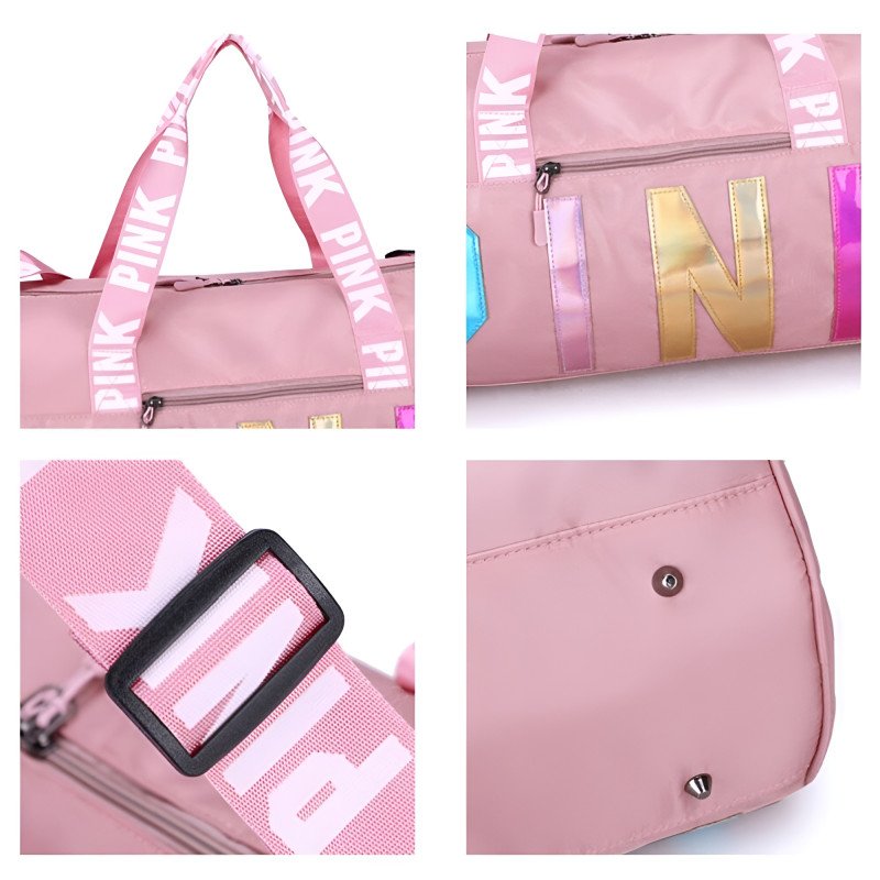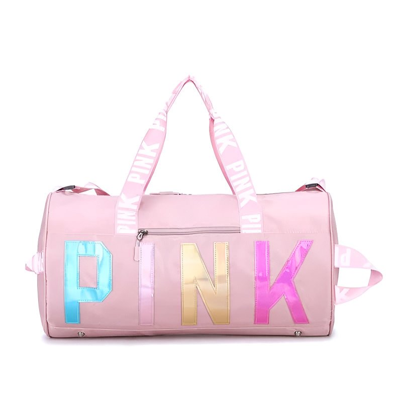 Elevate your fitness and travel style with this modern sports duffel bag. Designed for those who appreciate both functionality and flair, this bag features a bold "PINK" design with reflective, shimmering letters that catch the light beautifully. Whether you are heading to a heavy workout session at the gym or packing for a quick weekend getaway, this bag offers the perfect blend of durability and trendy aesthetics.
