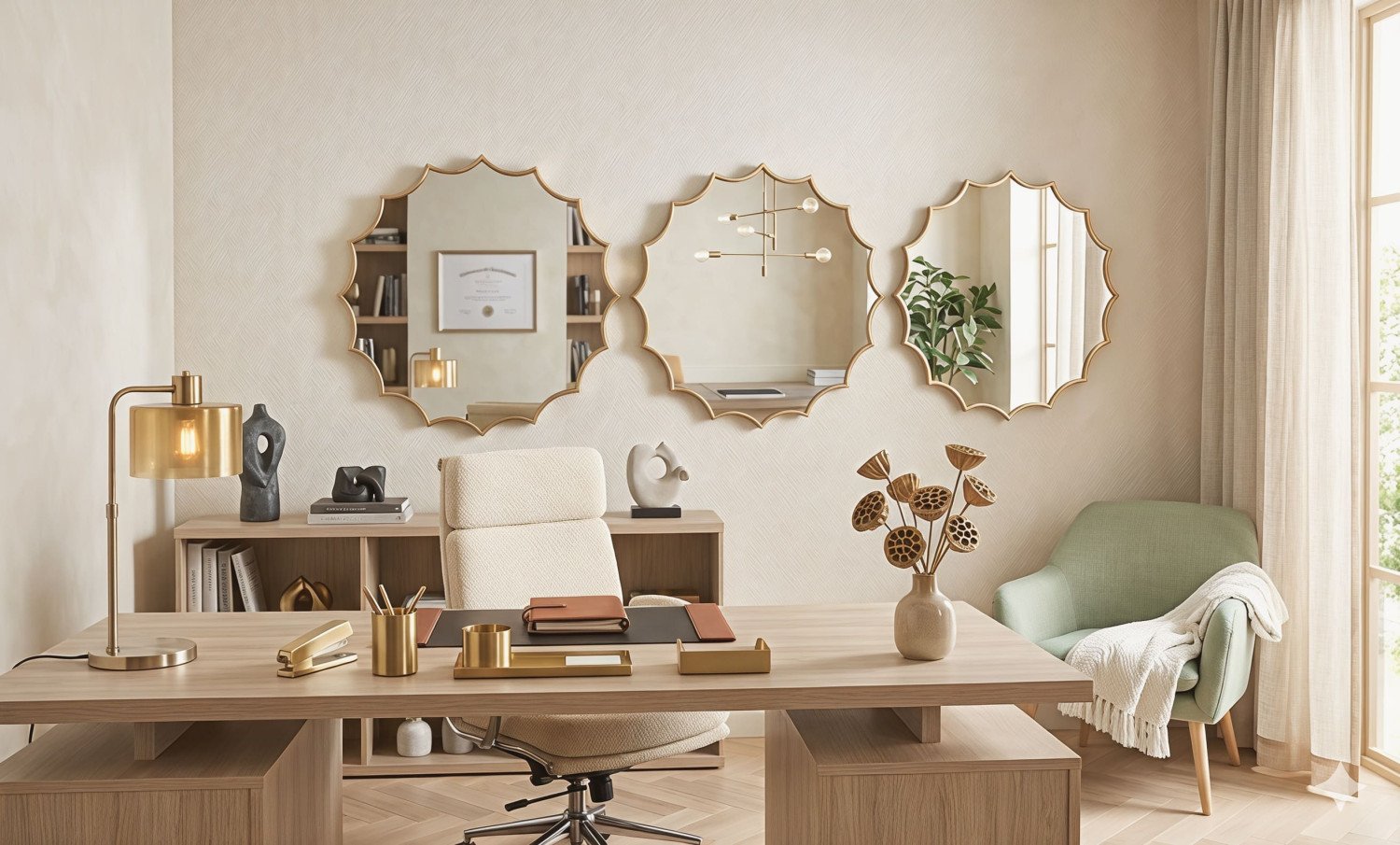 Elevate the aesthetic of your living space with this exquisite set of three decorative wall mirrors. Each piece features a stunning golden frame with a unique starburst or scalloped edge design that blends modern flair with classic elegance. These mirrors are designed to be more than just functional items; they are artistic statements that reflect light and style throughout your home.
