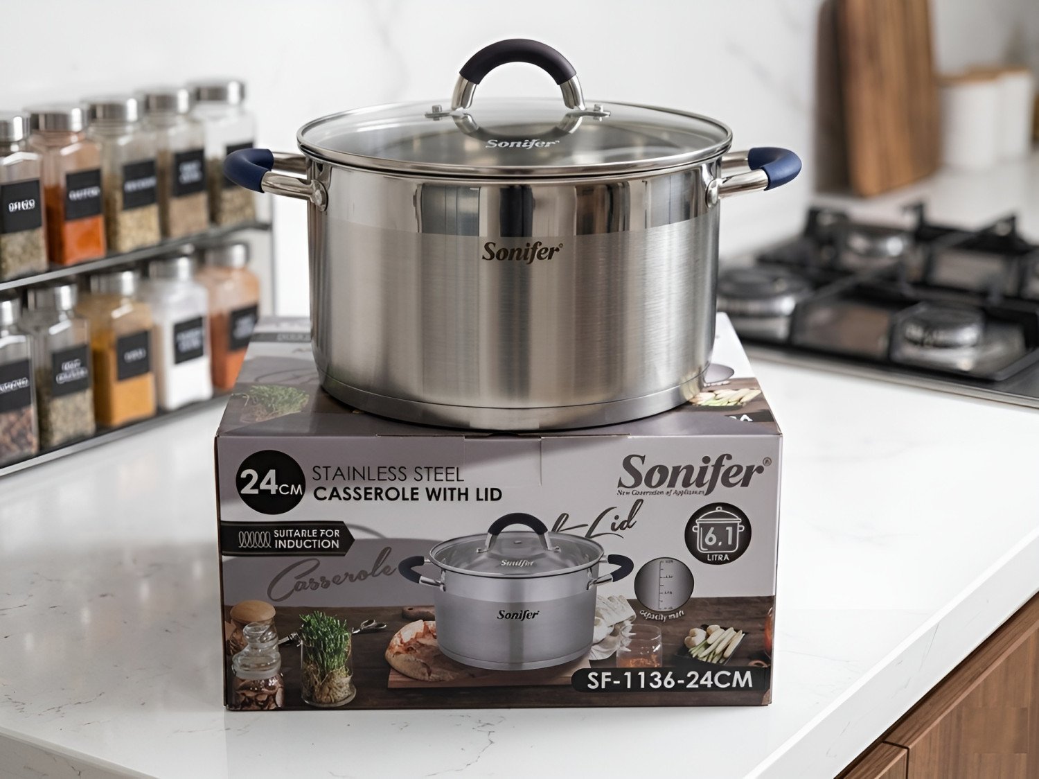 Upgrade your kitchen experience with this premium Sonifer stainless steel casserole pot. Designed for both professional and home use, this pot combines durability with a sleek polished finish to deliver outstanding cooking results. Whether you are simmering stews or boiling pasta, its generous 6.1 liter capacity ensures you have enough space for family sized meals while maintaining even heat distribution throughout the cooking process.