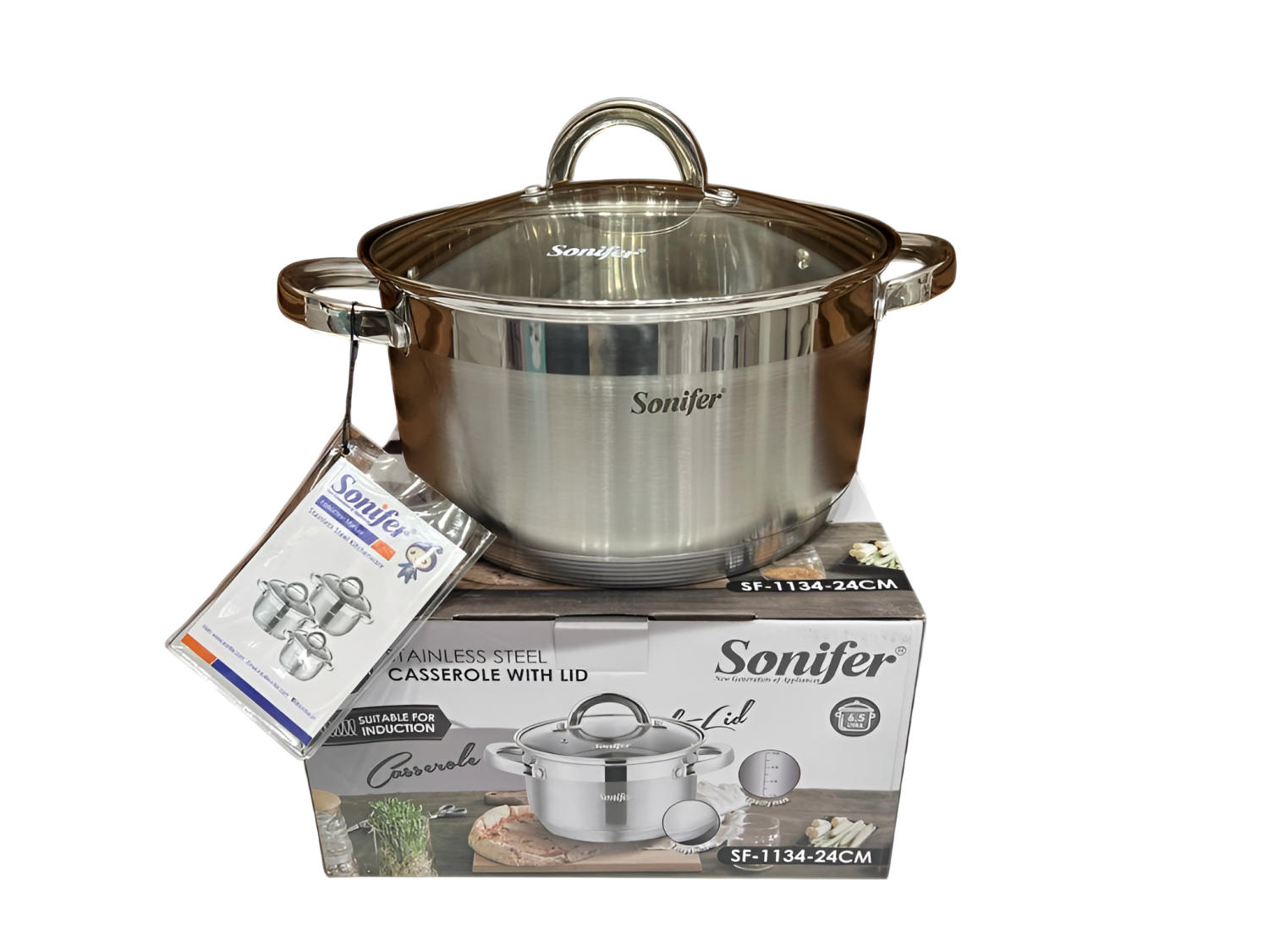 Elevate your cooking experience with the Sonifer Stainless Steel Casserole. This professional grade pot is designed to deliver exceptional heat distribution and durability for everyday home use. Featuring a generous 6.5 liter capacity and a 24cm diameter, it is the perfect companion for preparing hearty family meals with ease and style.
