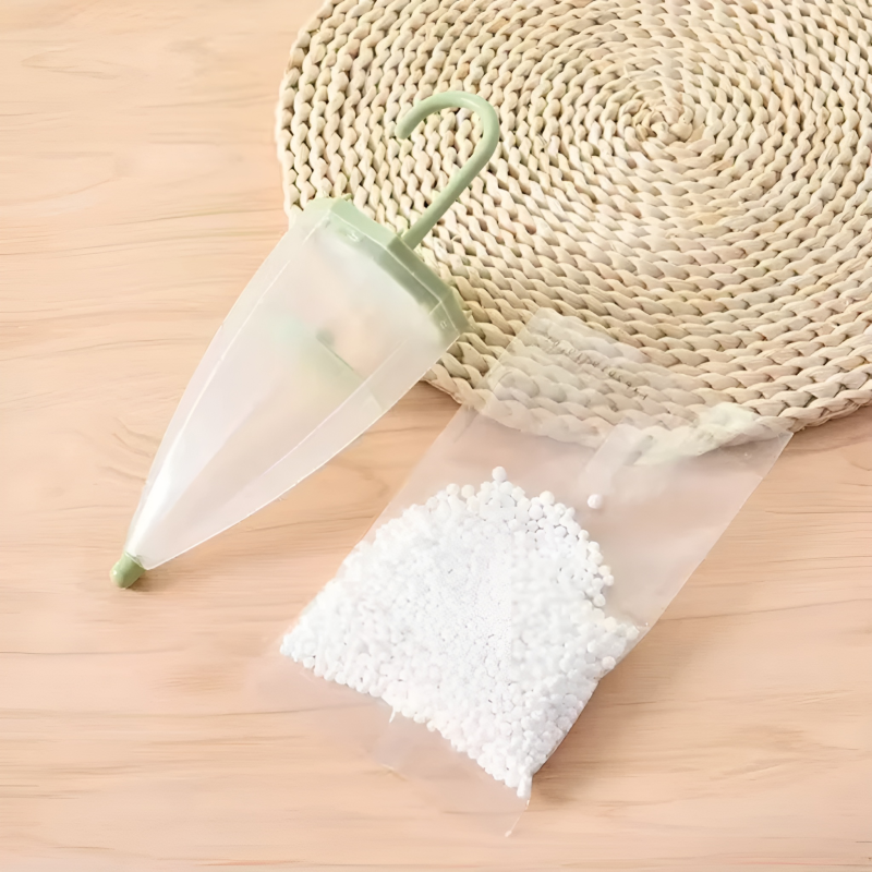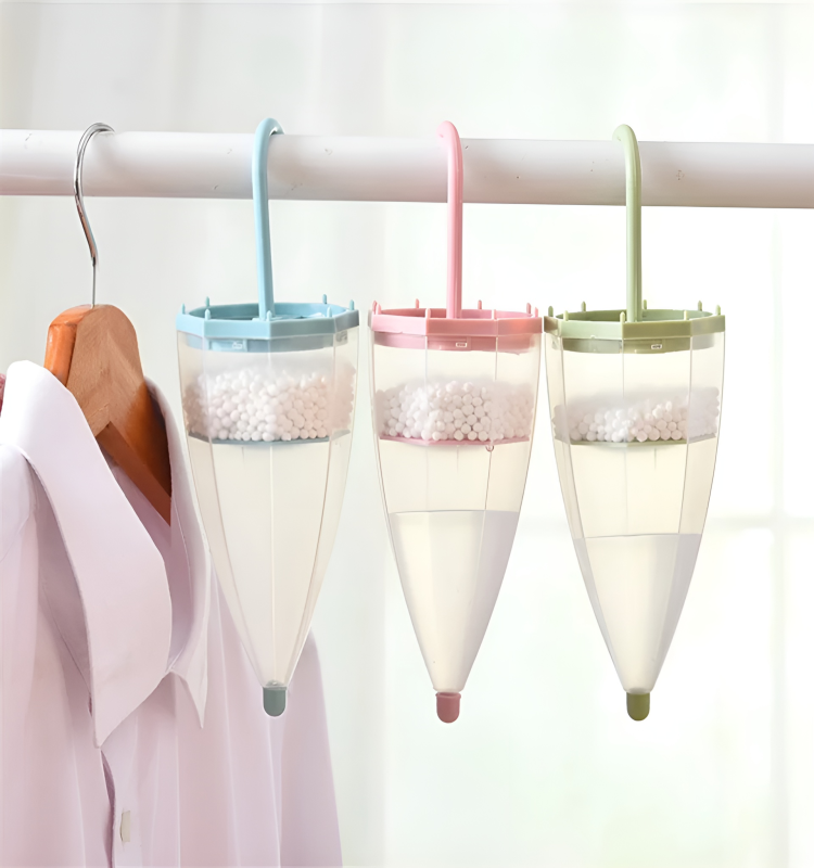 Keep your clothes fresh and dry with this Creative Umbrella Hanging Dehumidifier. This practical household tool is specifically designed for small, enclosed spaces like wardrobes, cabinets, and shoe racks. As the white moisture-absorbing particles pull humidity from the air, the water collects visibly in the transparent lower section, allowing you to easily monitor when it’s time for a replacement.