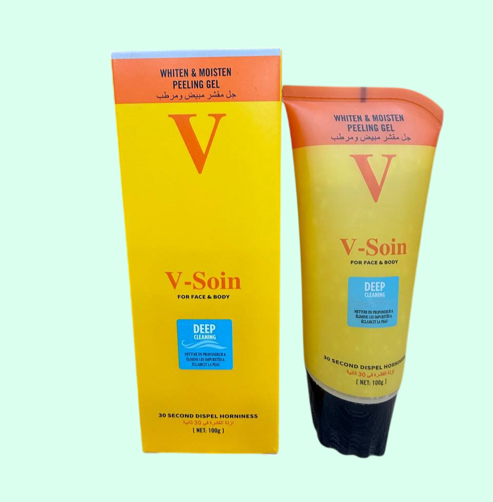 Enjoy a professional skin renewal at home with V-Soin Whiten and Moisten Peeling Gel. This formula is designed to eliminate dead skin cells and impurities, giving your skin a smooth texture and a radiant look. Thanks to its specialized formula for both face and body, this product combines deep cleansing and intense hydration at the same time.
